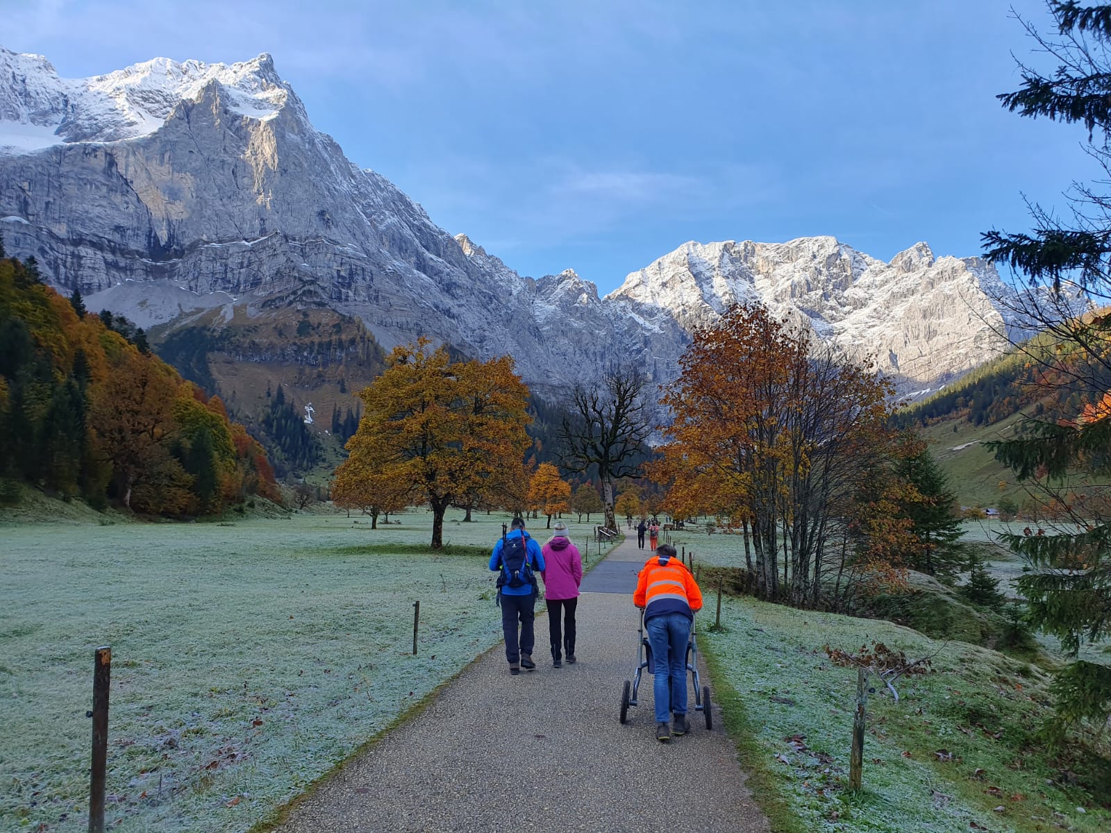 Since then I have been very happy again and my life quality has changed completely. With this rollator I can walk fantastically, often I am even faster than the "normal" pedestrians and I walk upright. Field, forest and meadow paths are not a problem. In September I was in the Tauern in Austria and went with the rollator from 1600m to 1900m up to the Giglachsee, see evidence photo, and that at the age of 78. A lot of people took pictures of my rollator and often they said: «Our grandma needs something like that as well, we have never seen it before». As you can see, even the cattle below Dachstein were interested in it.